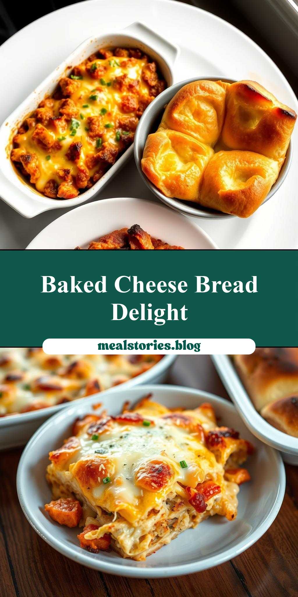 two images show different types of baked food in baking pans, one with cheese and the other with bread