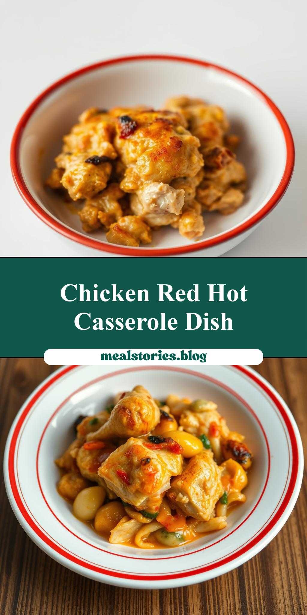 A delicious and easy-to-make chicken casserole recipe, presented in a beautifully rustic white bowl with a vibrant red border around the top and bottom.