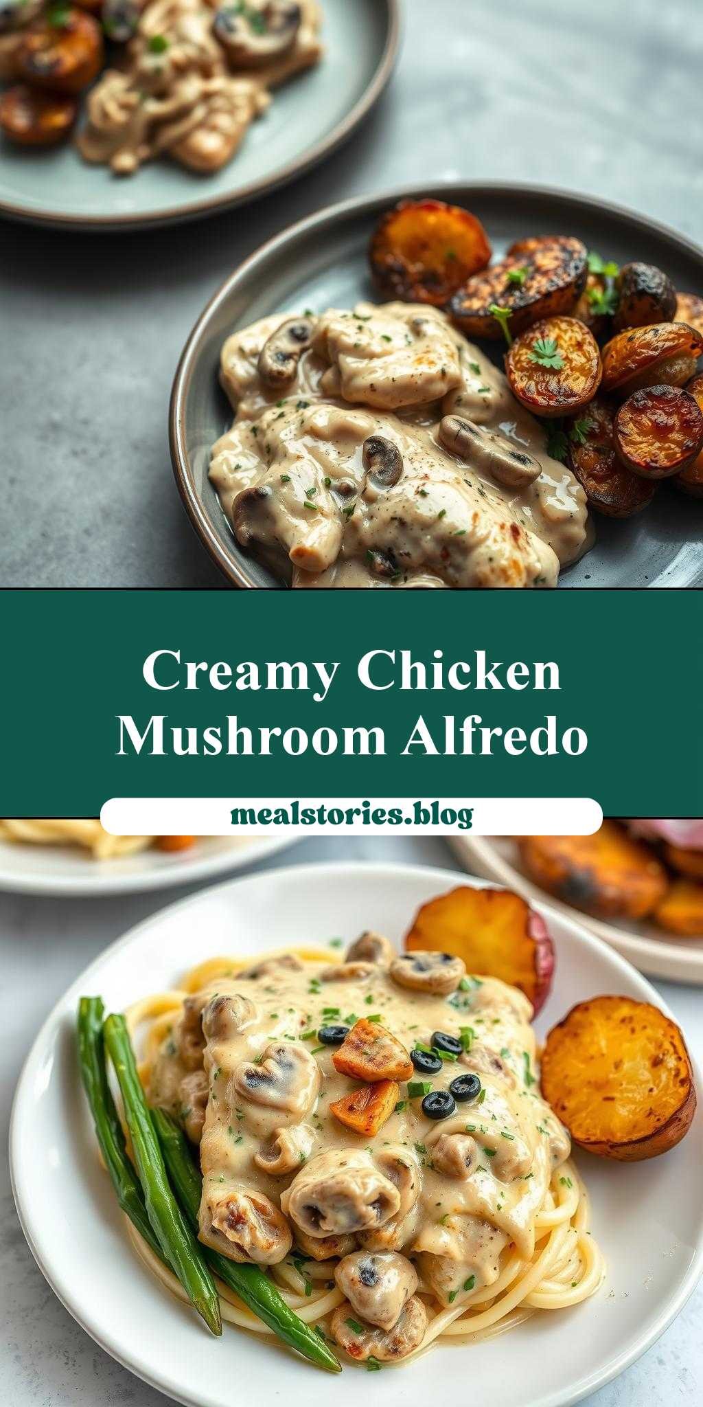 two plates with different types of food on them and the words creamy mushroom chicken alfredo recipe with hot honey roasted potatoes