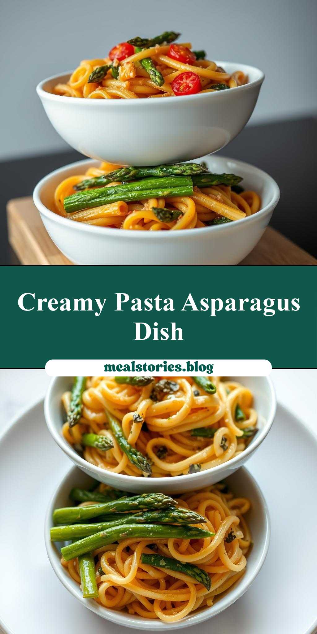 A delicious and visually appealing dish featuring pasta and asparagus stacked in two white bowls, perfect for any occasion with its balance of flavors and ease of preparation.