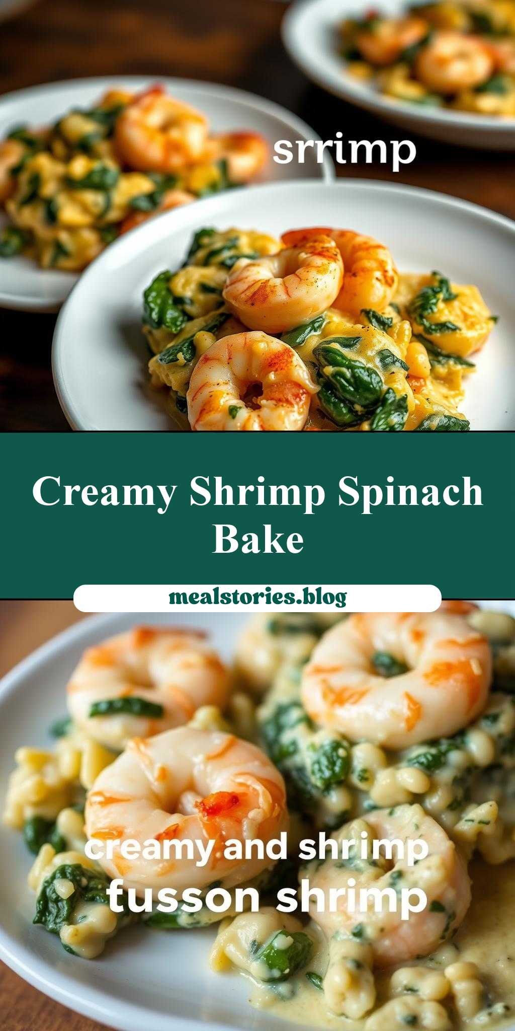 two pictures of shrimp and spinach casserole with text overlay that reads creamy tusson shrimp
