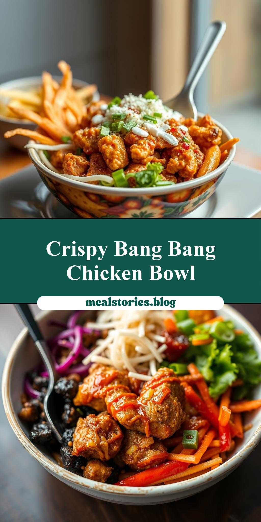 A flavorful and crunchy chicken bowl dish made with chicken, vegetables, and a spicy Bang Bang sauce, served over rice.