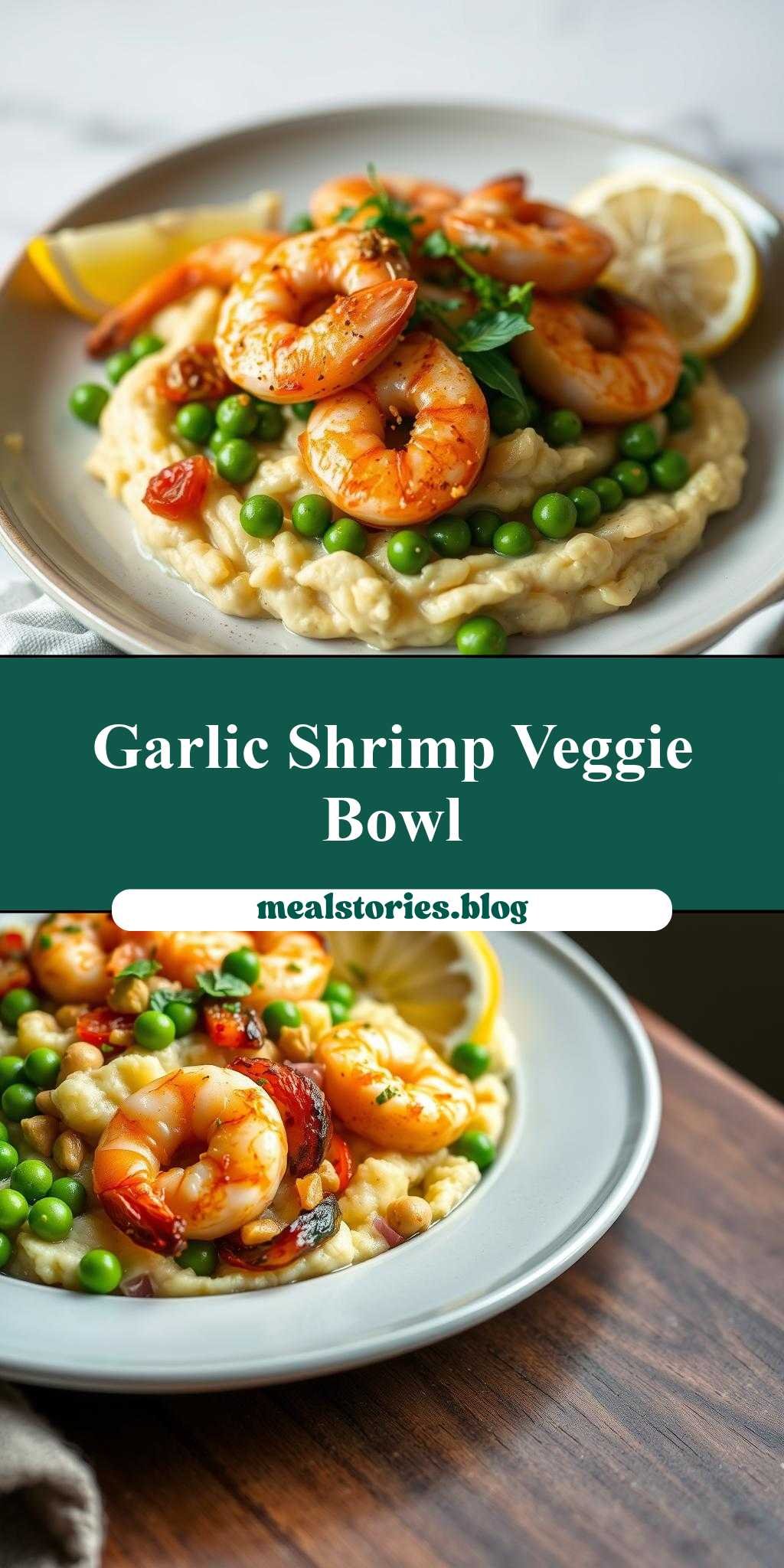 A flavorful and easy-to-make dish combining garlic butter shrimp, veggie mash, peas, and lemon, perfect for a quick dinner or special occasion.