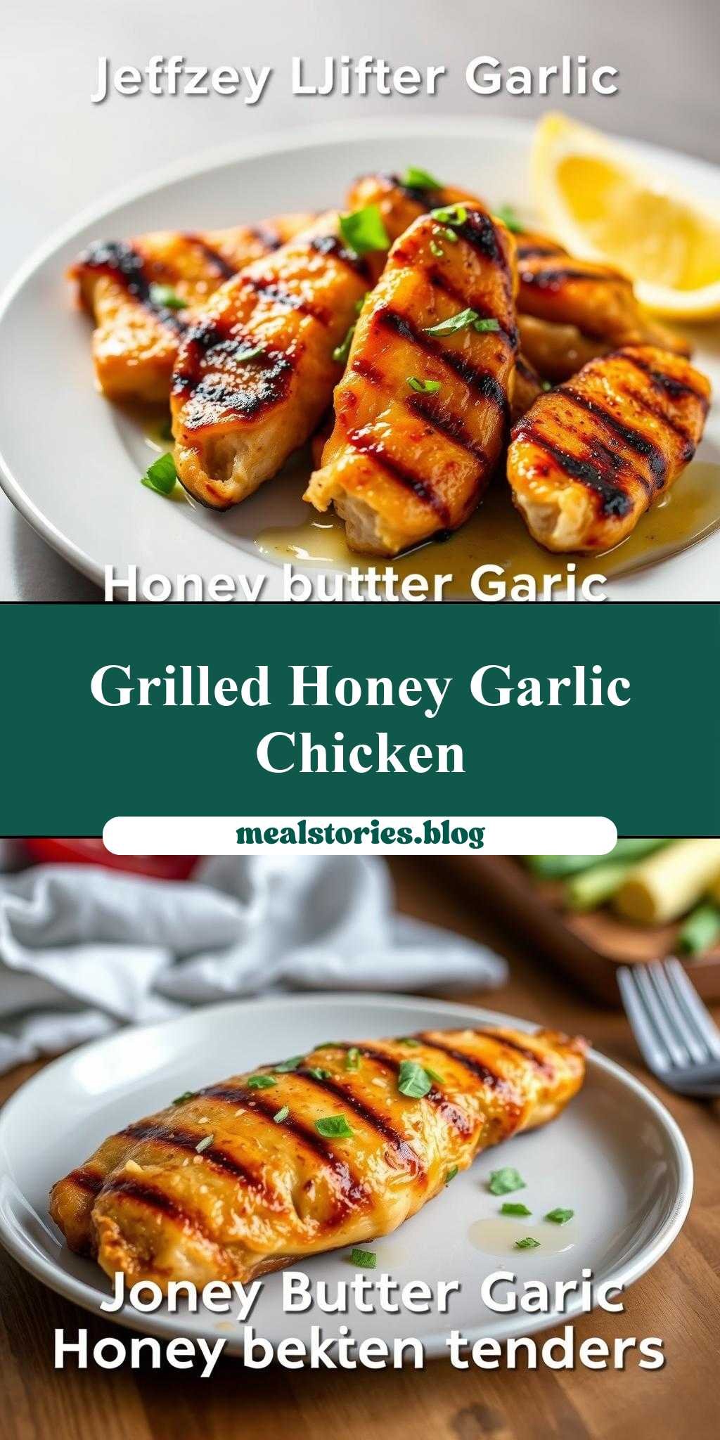 grilled honey butter garlic chicken tenders recipe on a plate with text overlay