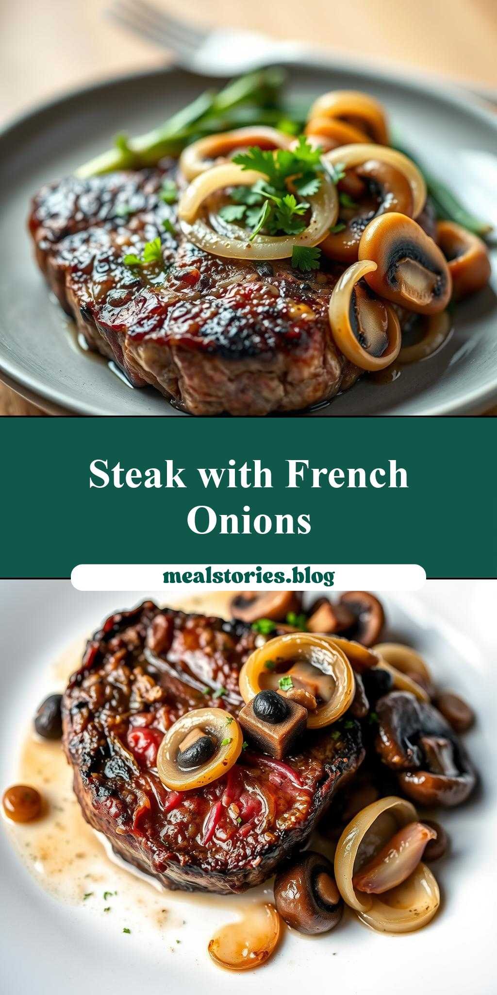 A rich and flavorful dish combining grilled ribeye steak with caramelized French onions and sautéed mushrooms, perfect for special occasions or weeknight dinners.