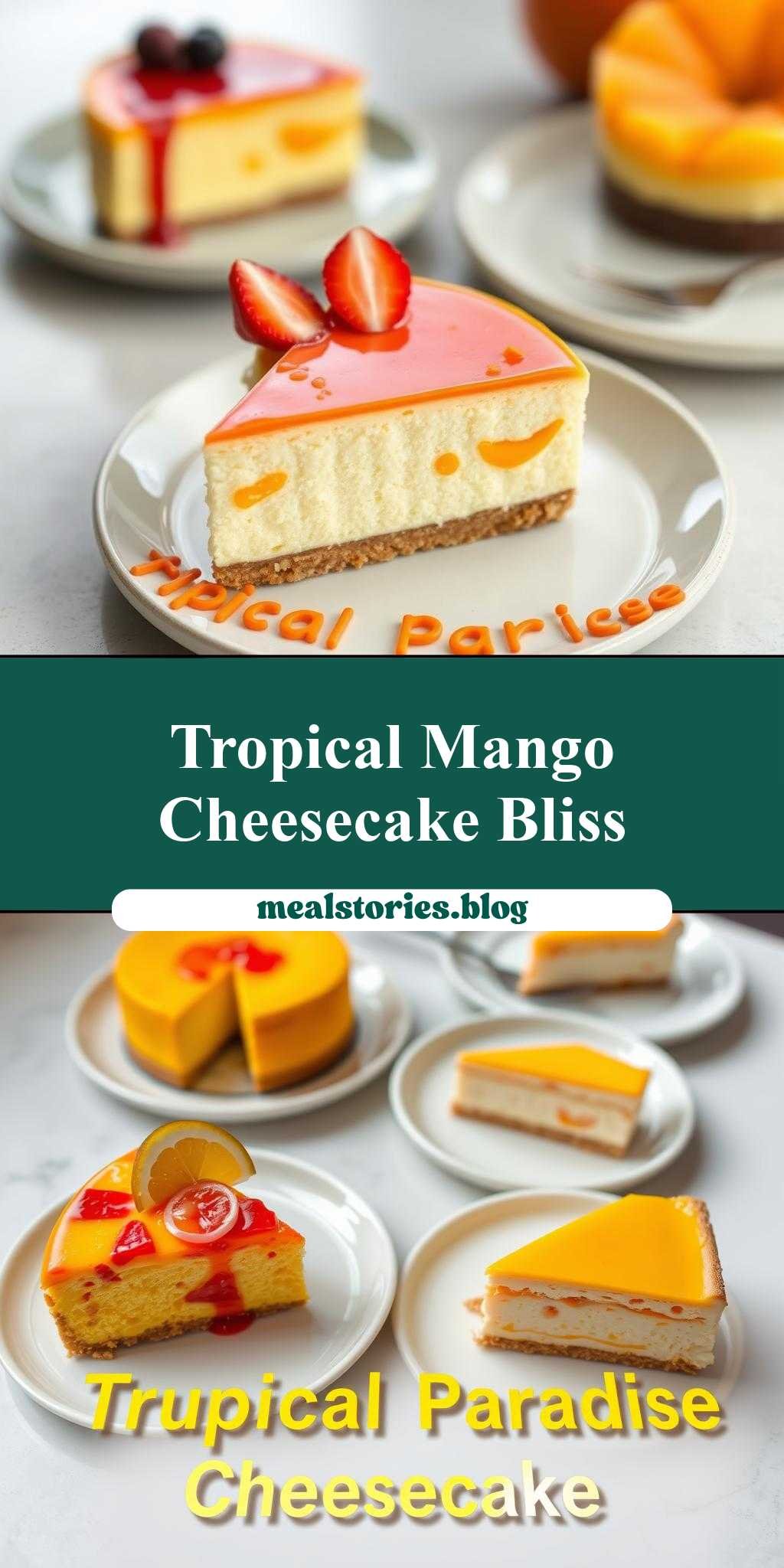 three different types of cheesecakes on plates with the words tropical paradise mango cheesecake
