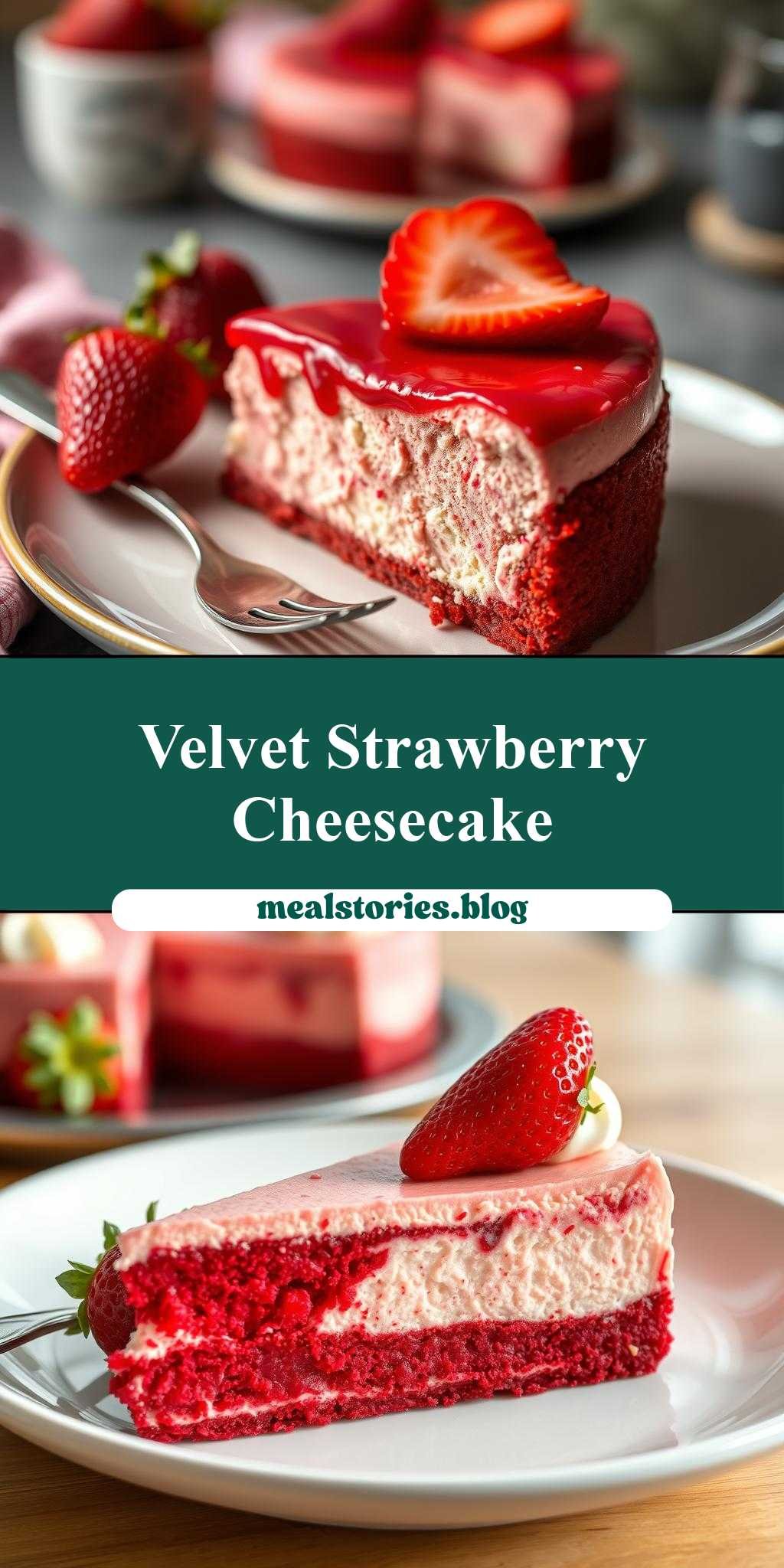 A rich and creamy cheesecake with the deep flavor of red velvet and the sweetness of strawberries, perfect for any occasion.